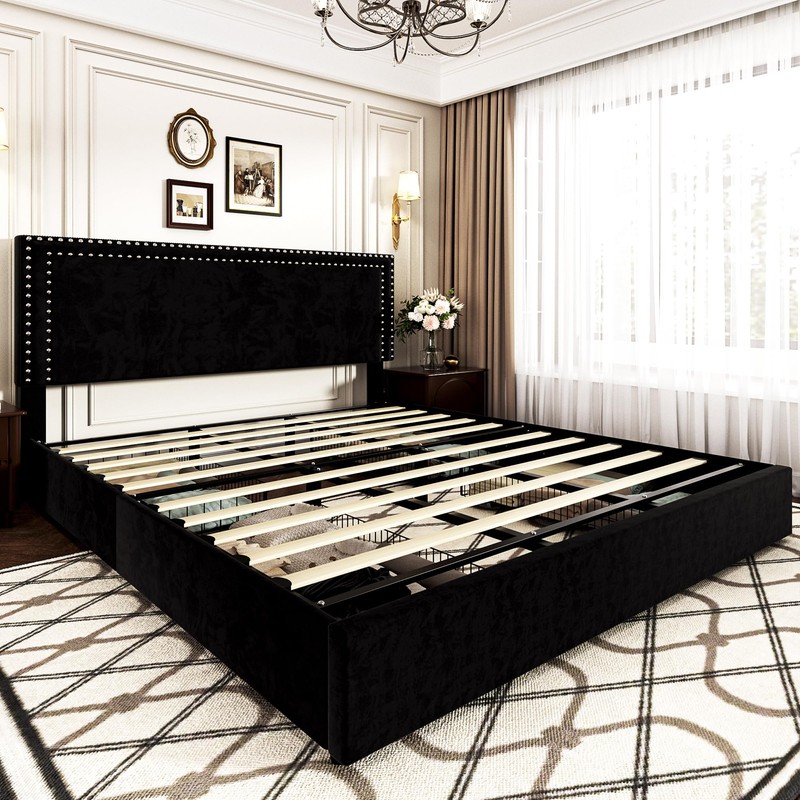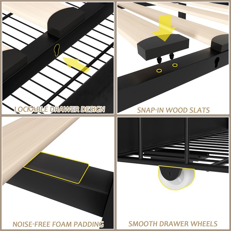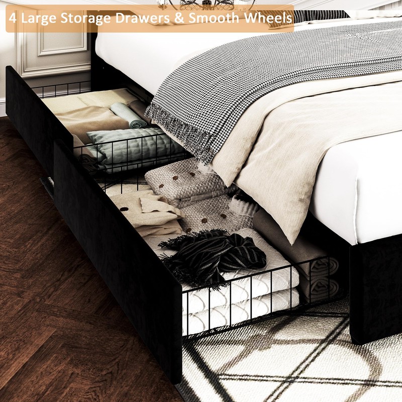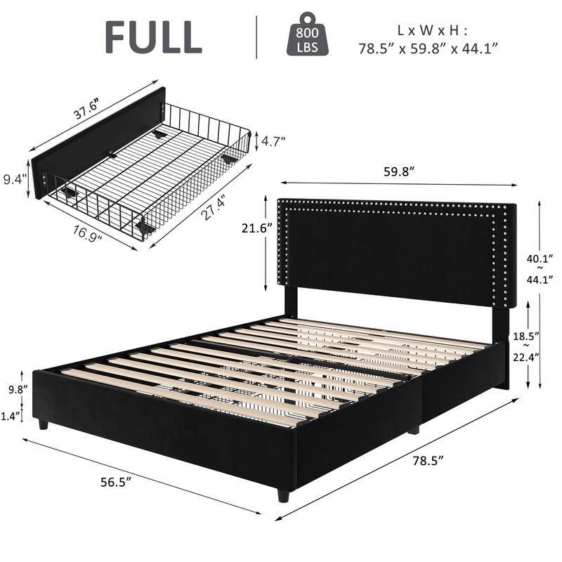 - [Stylish Bed Frame with 4 Storage Drawers] – Maximize your space with this full bed frame featuring four spacious storage drawers, complete with easy-glide wheels for effortless access. Each drawer (37.5’’L x 16.9’’W x 9.4’’H) offers ample room for seasonal bedding, clothing, toys, and more, keeping your bedroom organized and clutter-free.