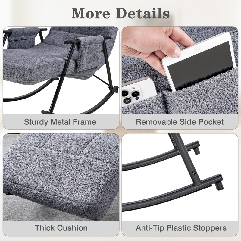 - Side Pocket & Anti-Tip Design: The nursery chair features a removable side pocket for easy access to your phone, iPad, books, or magazines. Plastic stoppers at the end of the legs prevent the rocker from tipping backward, allowing you to enjoy comfort with complete peace of mind.