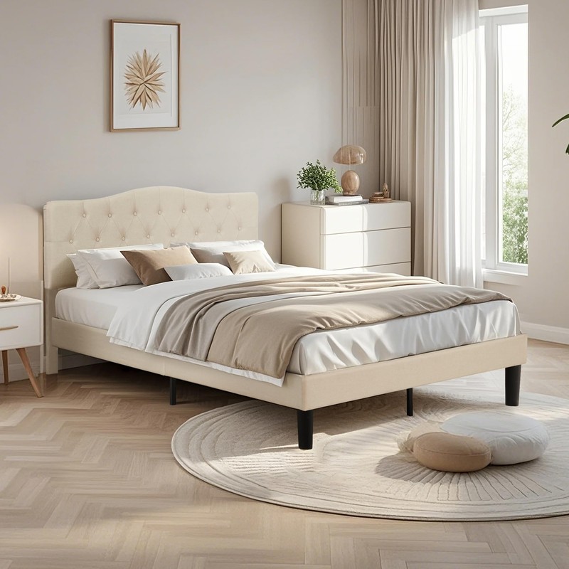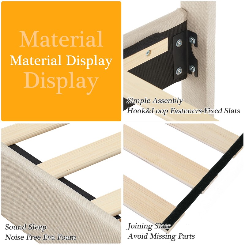 - 【Sturdy Upholstered Bed Frame】Built with a heavy-duty metal frame and supported by 12 solid wood slats, the bed frame provides a strong central "+" structure and supports up to 800 lbs. The solid wood legs are smooth and durable, preventing floor scratches.