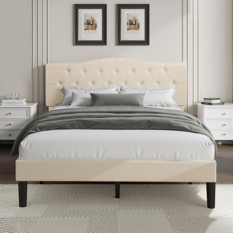 VECELO Queen Size Bed Frame Upholstered Platform with Tufted Adjustable Headboard/Mattress Foundation with Wood Slat Support, Easy Assembly,Beige