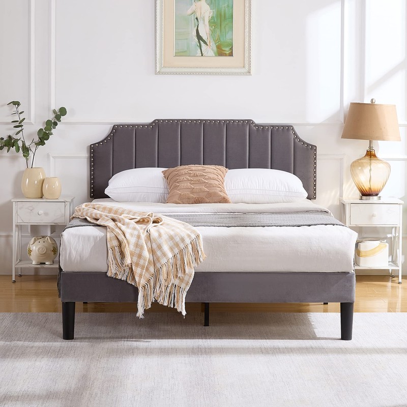 - 【Stylish and Comfortable】The queen size bed frame with Upholstered linen and tufted headboard, this classic upholstered bed frame can match a variety of bedroom styles perfectly. Thick and dense foam padding gives you comfortable touch.