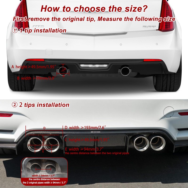 • 【Perfect Fit for 2.5” Tail Pipe】Designed with a 2.5 inch inlet and 3.5 inch outlet, this exhaust tip is compatible with 2.5” outer diameter tail pipes. Ensure your vehicle’s bumper space is at least 4 inches wide