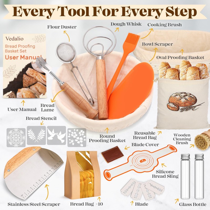 • GET MORE FOR LESS - BEST VALUE SOURDOUGH KIT BREAD MAKING KIT! Including Round Proofing Basket ( Inch) X , Oval Proofing Basket ( Inch)  , Dough Whisk X , Bread Lame X , Blade X , Blade Cover  , Bowl Scraper  , Stainless Steel Scraper X , Flour Duster X , Silicone Bread Sling X , Wooden Cleaning Brush  , Cooking Brush  , Bread Stencil X , Bread Bag X , Reusable Bread Bag X , Glass Bottle  , User Manual X . Use these bread making accessories sour dough kit to start your journey to delicious bread.