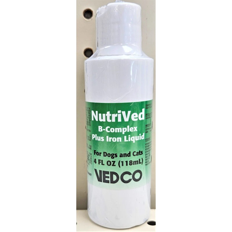 NutriVed B-Complex Plus Iron Liquid for Dogs & Cats 4oz (118ml) by Vedco. For supplementation of the diet to aid in the prophylaxis and treatment of iron, copper, amino acid, and vitamin B-complex deficiencies in young or orphaned dogs and cats and convalescent or debilitated dogs and cats. Can be given orally or mixed with food. Thanks for looking and have a fine day!