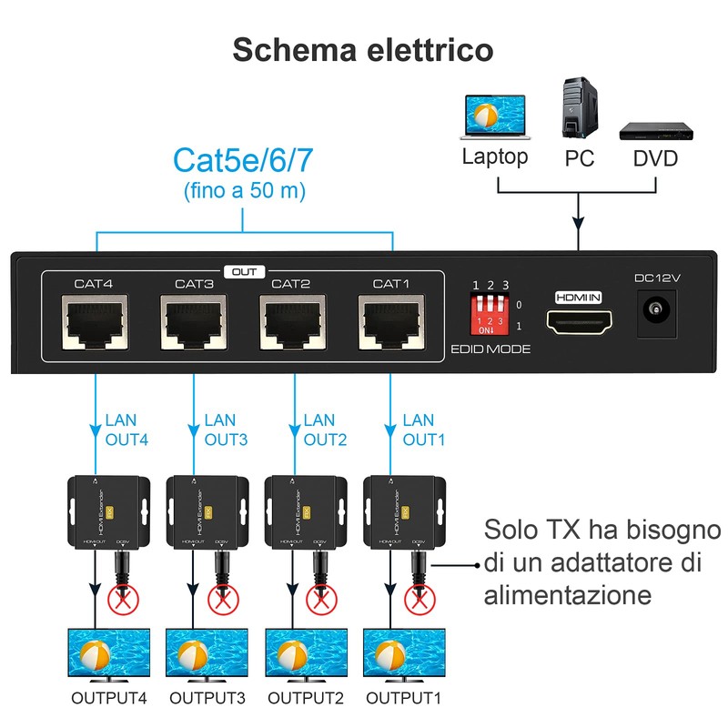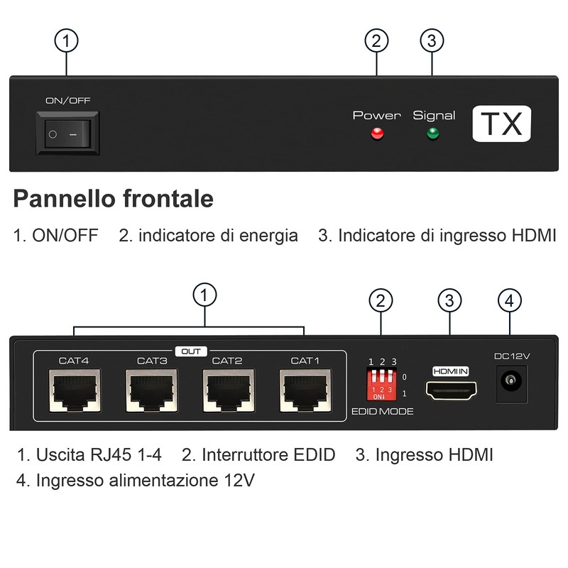 3. Connect single CAT6 cables up to 165 feet in length instead of an HDMI cable between TX and RX extender 4. Connects the 12V power supply to POC technology, everything there & ograve; you need to do & egrave; use the power supply for TX and RX PU & ograve; work