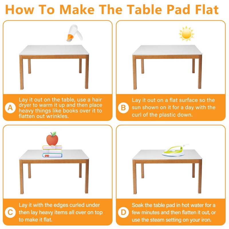 - 🟡【VeeCano QUALITY ASSURANCE】24/7 Hours Customer Service. CONTACT US FIRST if you are not satisfied with our table pad, REFUND OR REPLACE AVAILABLE. As the new clear table pads are rolled packed, so it will be a little wrinkled and warped edge. The solution is : A. Heating it with a hair dryer to make it flat; B. Lay it in the sun for half an hour; C. Lay out in reverse-roll direction and put something heavy on top of it; D. Stick the double sided table dots between table and the protector.