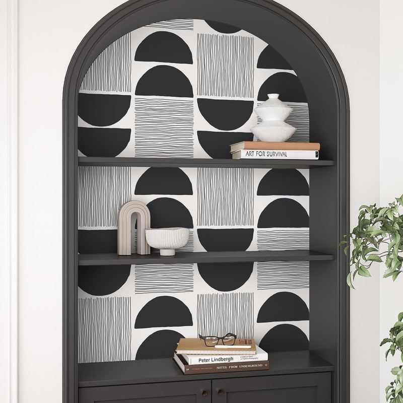 - ๐๐ซ๐จ๐๐ฎ๐๐ญ ๐๐๐ญ๐๐ข๐ฅ๐ฌ: Geometric wallpaper, mid century style, modern black and white color, bring a touch of bohemian to your space. Made of thick vinyl, durable. 17.7 inch wide by 118 inch long, covers 14.5 Sq. Ft. each roll, straight match