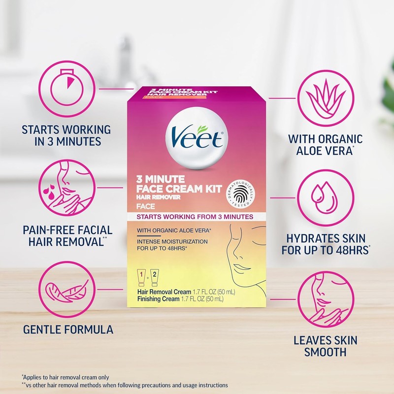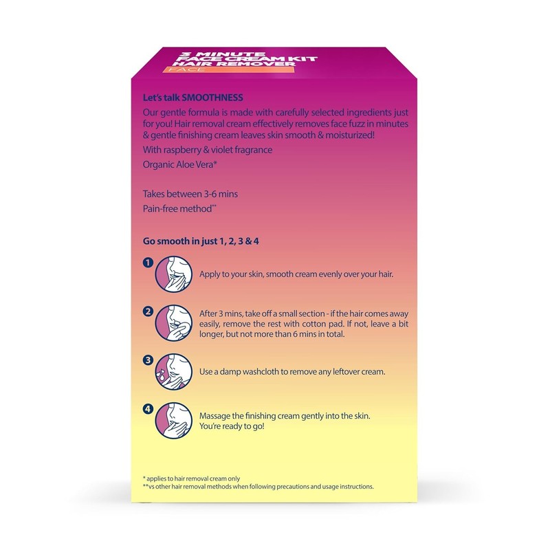 - VEET HAIR REMOVAL CREAM: Experience pain-free** facial hair removal for women with the Veet 3 Minute Face Cream Kit featuring soothing organic aloe vera* & a raspberry & violet fragrance for gentle, effective face fuzz removal in just minutes