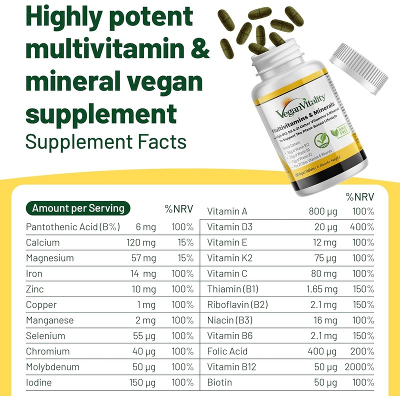 • HIGH STRENGTH MULTIVITAMIN - our all-rounder Vegan Vitality's multivitamins provide a wide range of benefits by rejuvenating your energy levels and supporting your immune health. Our multivitamin with iron offers a balanced combination of nutrients in one daily tablet to help reduce the risk of deficiencies. These vegan vitamins also contain vegan vitamin B12, vitamin E and K2 along with 19 other minerals.