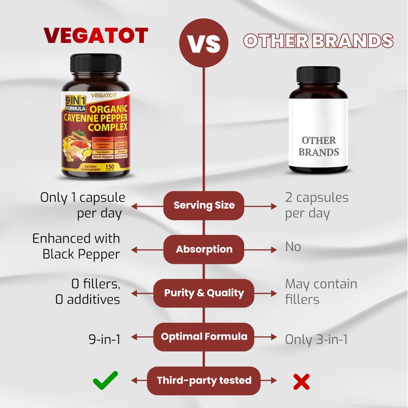 - t️ REMARKABLE POTENCY: Vegatot Cayenne Pepper Supplement features a powerful blend of 9 carefully selected natural ingredients. Additionally, Every capsule contains a concentrated form of herbal powder, ensuring maximum benefit. Our advanced formula simplifies your supplement routine, allowing you to experience the full range of advantages with the ease of taking just one capsule daily.