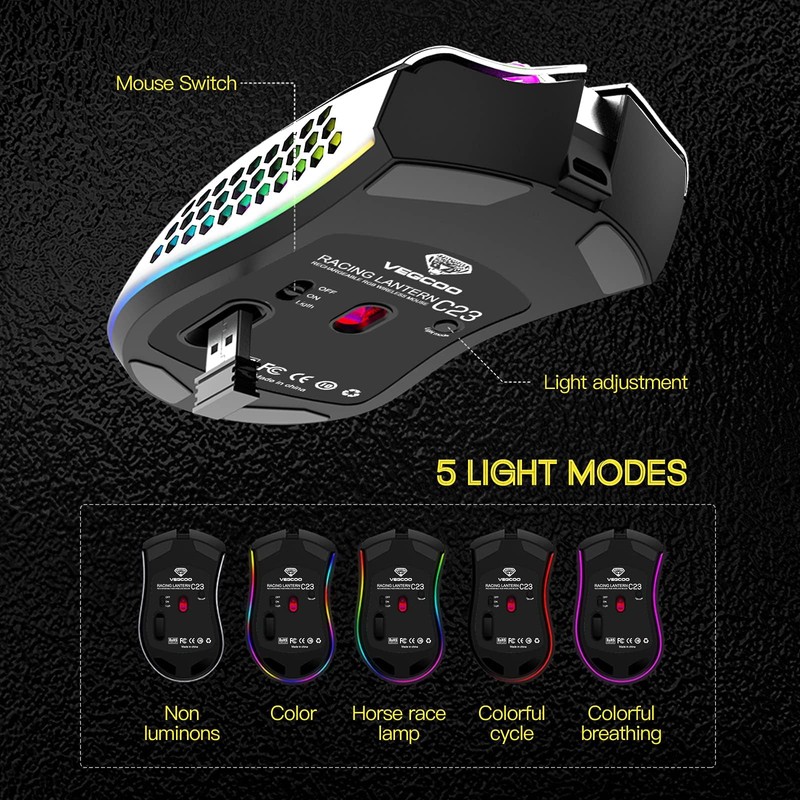- 【Lightweight Honeycomb Shell】The stylish honeycomb shell design makes the wireless gaming mouse lightweight and convenient, and it is shockproof. It also helps with air circulation, bringing all mouse grips a pleasant, cool and comfortable feel that keeps sweaty hands from disturbing you. Take your gaming experience to the next level!