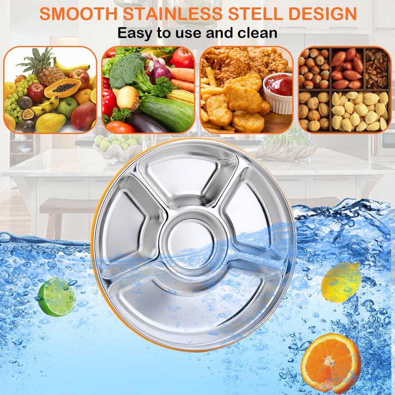 • 5-Compartment Design: Measuring ​​10.6" x 2"​​, this divided plate features 5 individual sections along with a central dressing bowl. It is ideal for organizing and serving salads, vegetables, fruits, chips, nuts, and other snacks at gatherings.