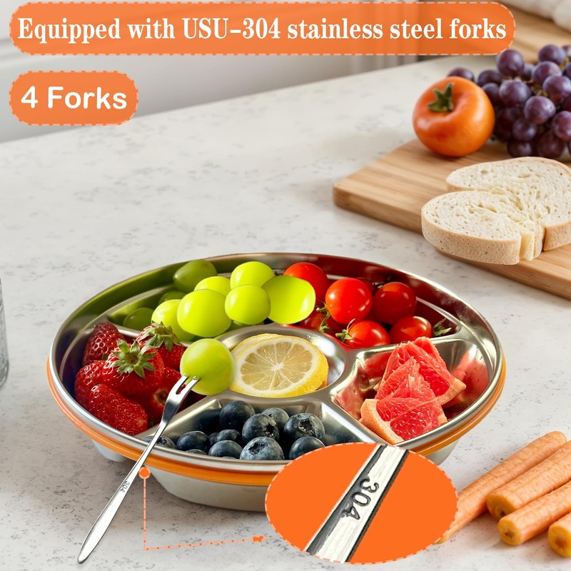 Veggie Tray with Lid, Divided Serving Tray with Lid, Stainless Steel Snackle Box 5 Compartments and 4 Forks Set for Picnic Party Platter, Vegetable Relish Fruit Tray