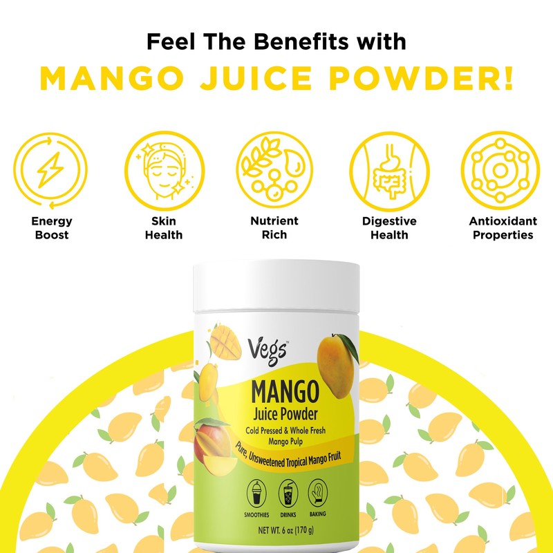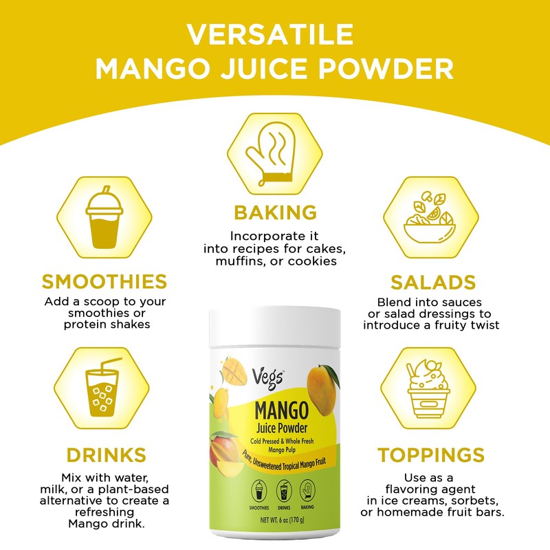 Vegs Mango Juice Powder - Freeze Dried & Cold Pressed Mango Fruit Pulp Concentrate - Unsweetened Tropical Fruit Powder for Smoothies, Baking, Desserts - No added Sugar, No Colors - 6 oz