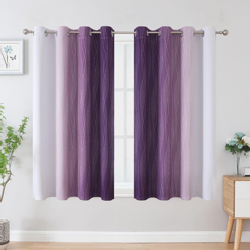 VEHEDE Blackout Noise Reducing Eyelet Curtains for Bedroom, Ombre Energy Saving Wave Printed Curtains for Living Room Small Window, W52 x L54 Inch, Purple and Greyish White, 2 Panels