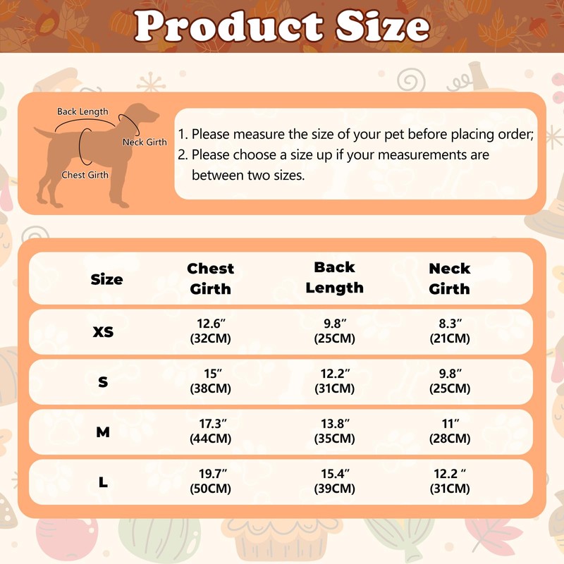 - 【4 Sizes in Available】The turkey stripe dog dresses are suitable for small to medium sized dogs. XS: Body Length is 9.8" / 25cm, Chest Girth is 12.6"/ 32cm, Neck Girth is 8.3" / 21cm. Please choose a size up if your measurements fall between sizes.