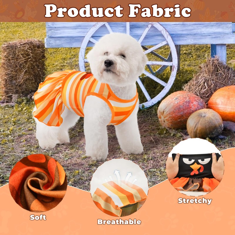 -Thanksgiving Theme: The puppy dresses are printed turkey pattern, and applied the tranditional color of Autumn, orange, yellow and brown, which are in keeping with Thanksgiving atomosphere.