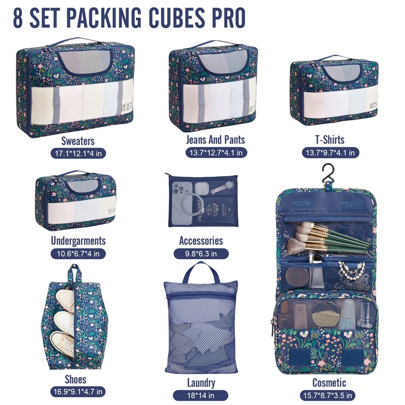 - Travel Without Worry: The set includes a hanging toiletry bag with four compartments to neatly store toiletries and cosmetics. Varying cube sizes help you sort and access your clothes with ease, saving time, avoiding mix-ups, and maximizing suitcase space—making travel more efficient and stress-free.