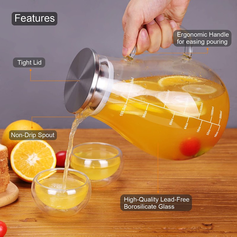 - Borosilicate glass: It is made of food-grade borosilicate glass, which is lead-free and durable. Ergonomically designed handle makes it easy to hold and pour. The scale of the generous pitcher body is visible and helpful that you can make the exact amount of drink to meet the various needs.