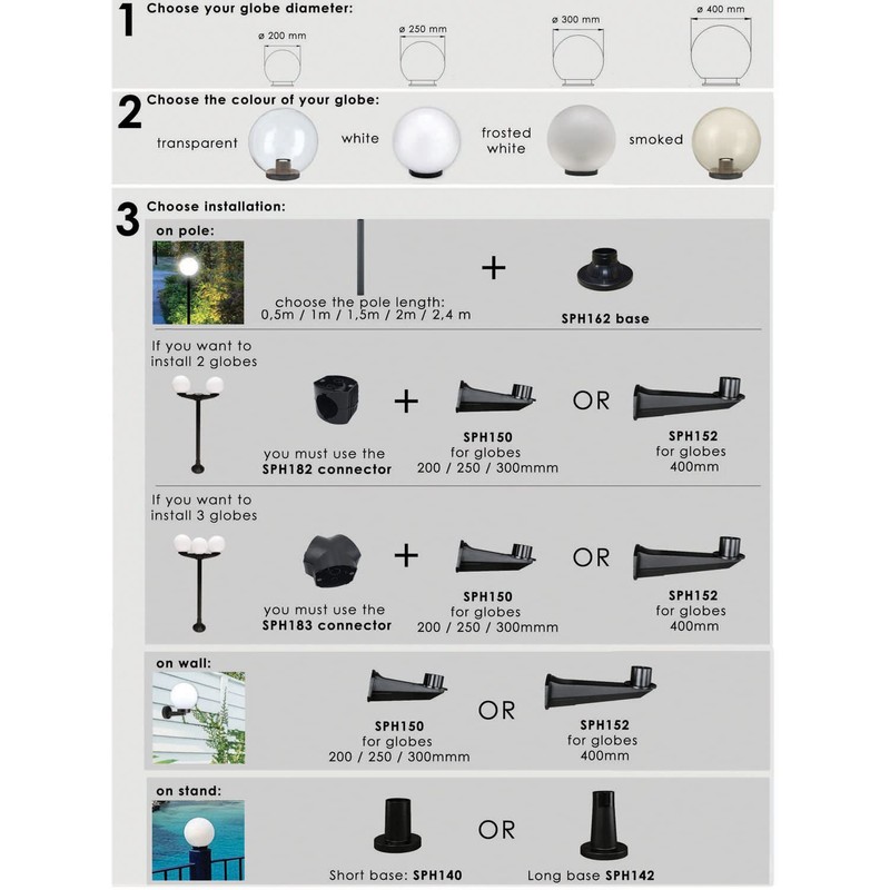 - Outer ball IP44, diameter 200 mm.