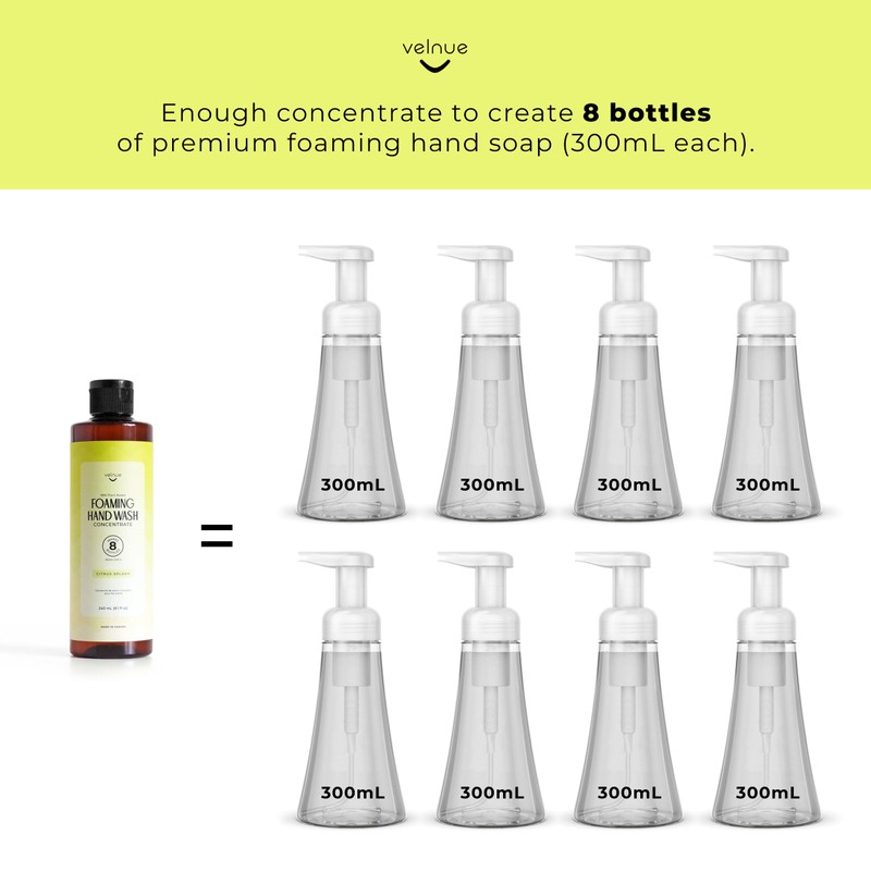 • 🧴 WHAT YOU GET: One 240mL bottle of foaming hand soap refill concentrate - enough to make 8 regular bottles of foaming hand wash - in our Citrus Splash blend.