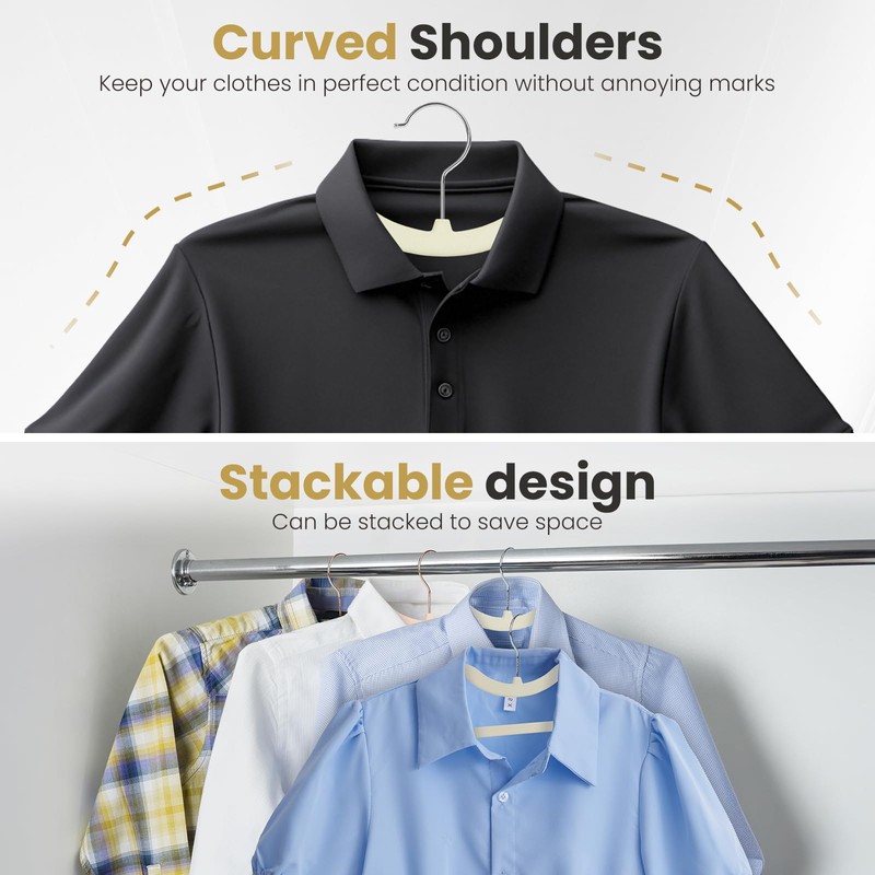 - Stackable Space-Saving Solution Each hanger’s 0.25-inch profile saves 50% closet space versus bulky alternatives. Stack vertically or nest horizontally for compact storage in homes, hotels, or boutiques