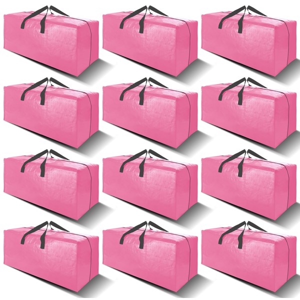 VELVETSURE 12 Pack Heavy Duty Large Moving Bags W/Backpack Straps - Strong Handles & Zippers, Storage Totes For Space Saving, Fold Flat, Alternative to Moving Box and Storage Bin, Pink