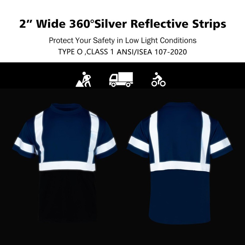 Design: Left chest pocket,black bottom,adopt striped hot stripe stamping design,2-inch wide silver reflective stripes surround 360°to protect your safety in low light conditions.