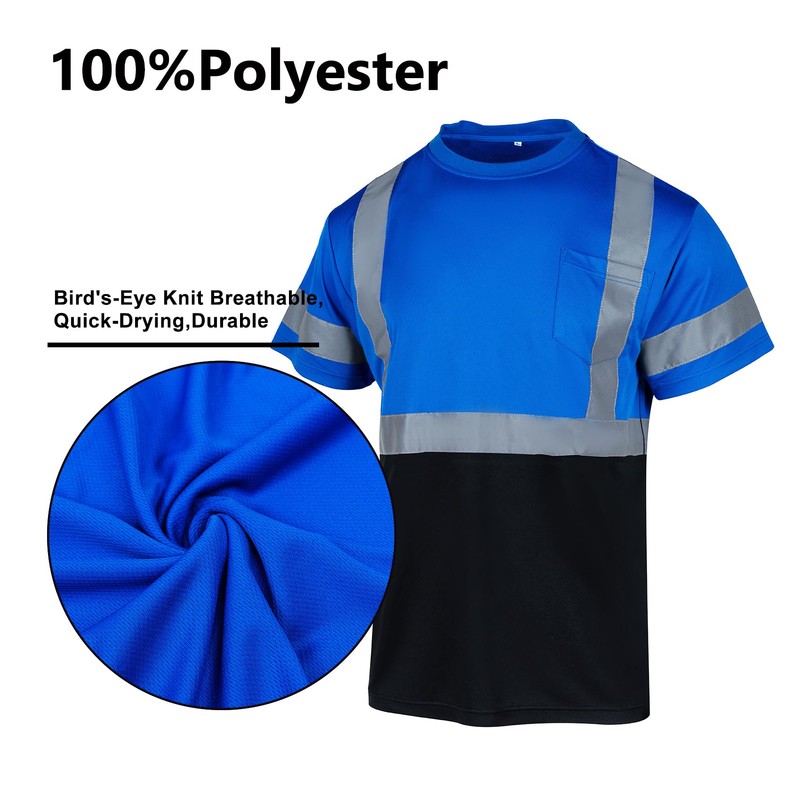 Material:The hi vis shirt is 100% polyester fabric,bird's- eye knit,breathable,lightweight,cooler moisture wicking experience.
