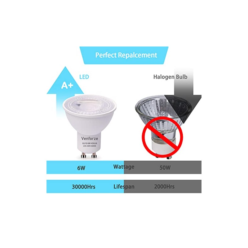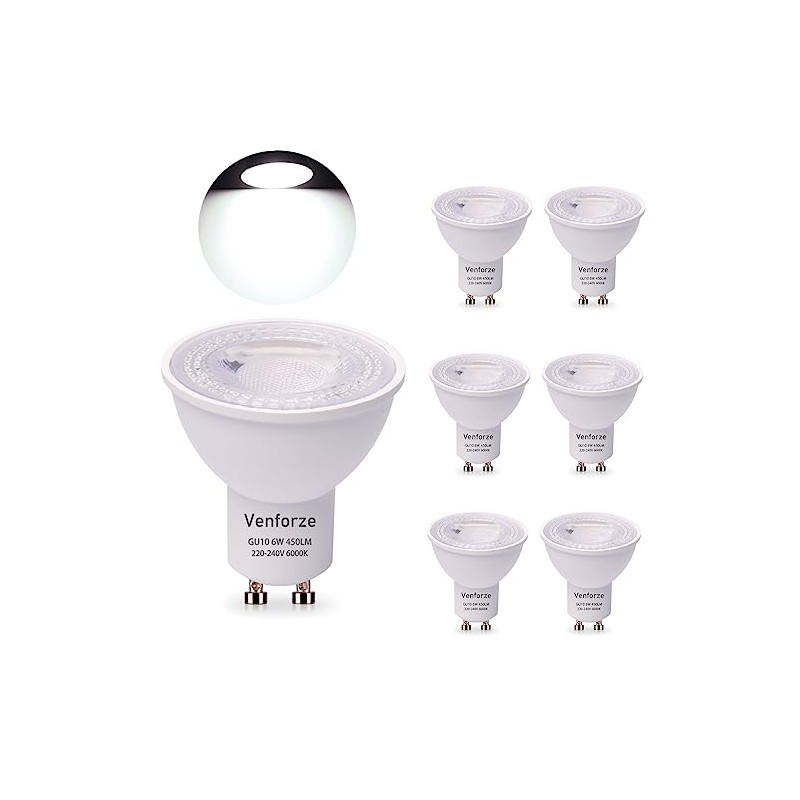 Venforze Venforze GU10 Led Bulbs Cool White, 6W 450LM 6000K Spotlight Bulbs, 38 Beam Angle Energy Saving Gu10 Bulbs, Track Led Spotlight Bulbs AC220-240V, 50W Halogen Equivalent, Non-dimmable, Pack of 6