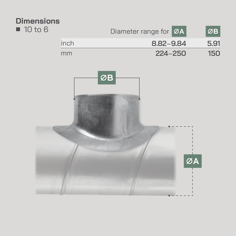 - Compatible with pipes with diameter from 8.81" to 9.84'' Inches. Take-off branch outlet for 6 Inch ducts (5.90" Inch outlet).
