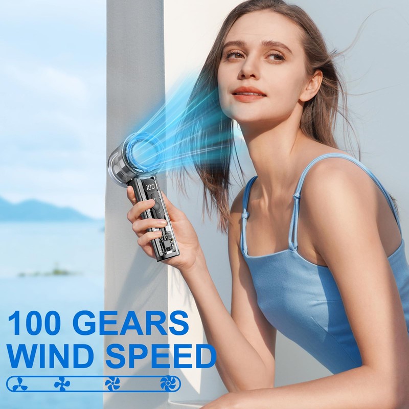 - 【MOTOR SIN CEPILLADO POTENTE】: El ventilador de mano tiene 100 velocidades y está equipado con un avanzado motor sin escobillas, por lo que es libre de elegir la velocidad del viento adecuada según sus necesidades y la temperatura ambiente. Viento suave/viento natural/viento fuerte/viento super fuerte puede satisfacer las necesidades de diferentes personas y diferentes ocasiones. Es un compañero indispensable para viajes, aventuras al aire libre y uso diario.