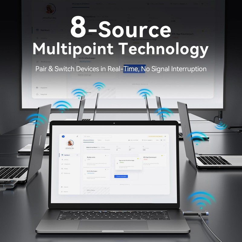 • Multiple Transmitters to One Receiver: Our kit allows simultaneous connection of multiple transmitters, simplifying the process of switching between different laptops or devices. You can use up to 8 pairs of kits in the same location without interference. While the receiver requires power via a USB-C port, the transmitter can be powered through the HDMI port, with the option to use USB-C if necessary