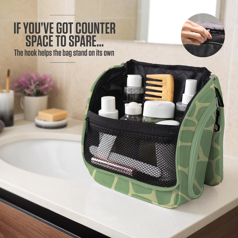 - ✅ HOOK FOR MORE SPACE - Hang the toiletry bag and save valuable counter space! The hook is small and held by a magnet when not used, so it will never be in your way. And if you want to keep the bag stable and upright, place the hook at the back of the bag. Voila!