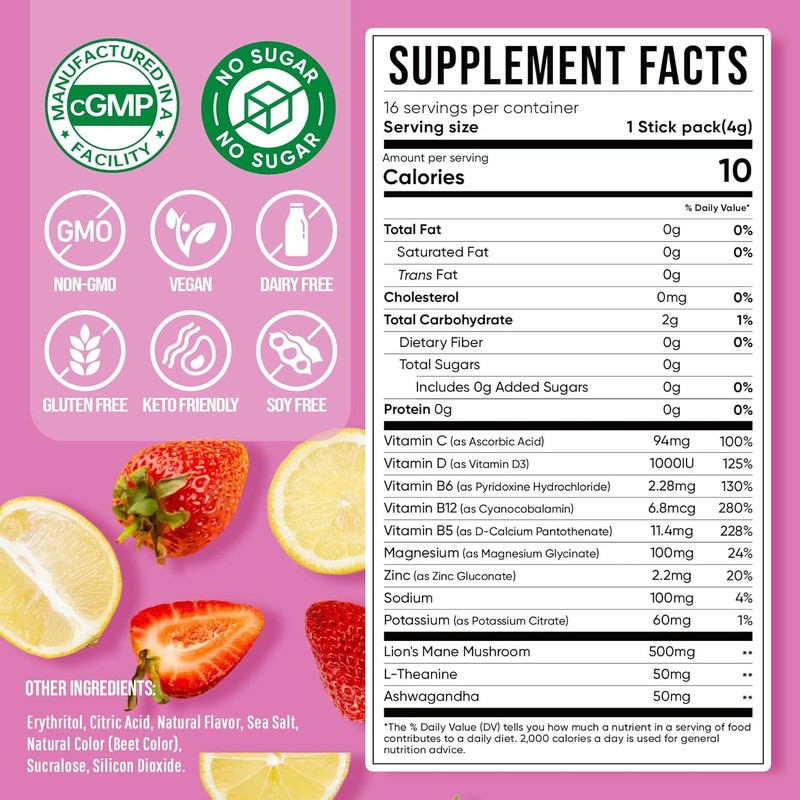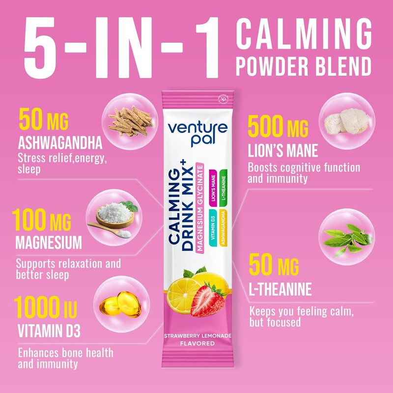 Venture Pal Magnesium Glycinate Powdered Drink Mix with Ashwagandha, Vitamin D, L-Theanine, Lions Mane, Sugar Free Magnesium Supplement Blend for Calm, Relax & Focus, Non GMO, Vegan, 16 Sticks