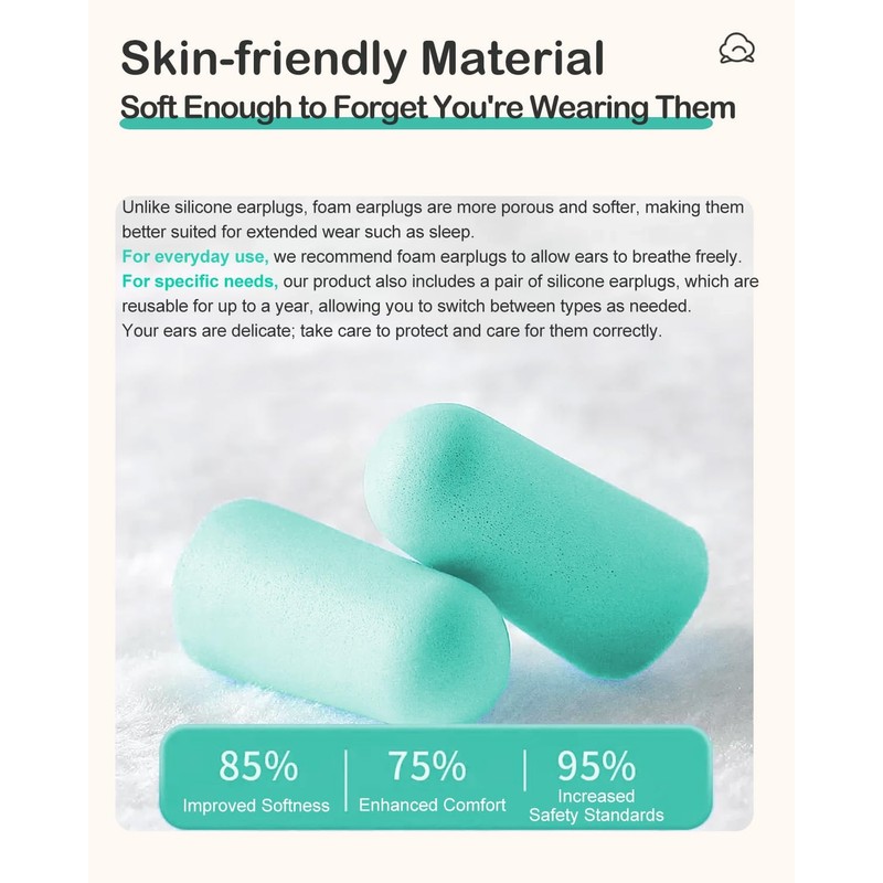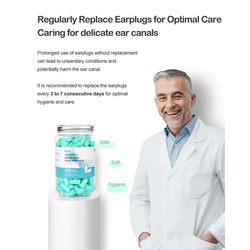 Our VeoryFly Soft Foam Noise Reduction Ear Plugs are made of sound-absorbing slow-release fat, purified by UV800 process, creating a soft touch like skin, and a smooth and delicate contact film on the surface.This allows your earplugs sleep to breathe freely without feeling bloated for extended periods of time.