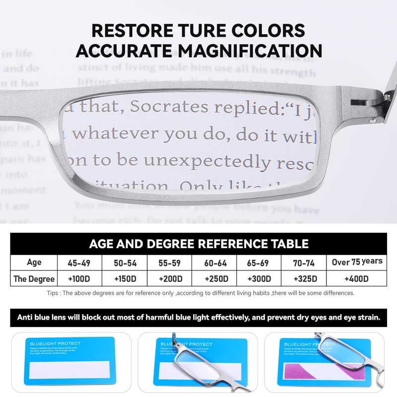- Anti-Blue Light Lens - These reading glasses lenses are made of special optical material and anti-blue light technology, which can effectively filter out most of the blue light, relieve dryness and fatigue of the eyes caused by long time use of electronic products, protect your eyesight health when looking at computers/mobile phones/TV, and can provide the right choice of lens degrees according to your vision needs.
