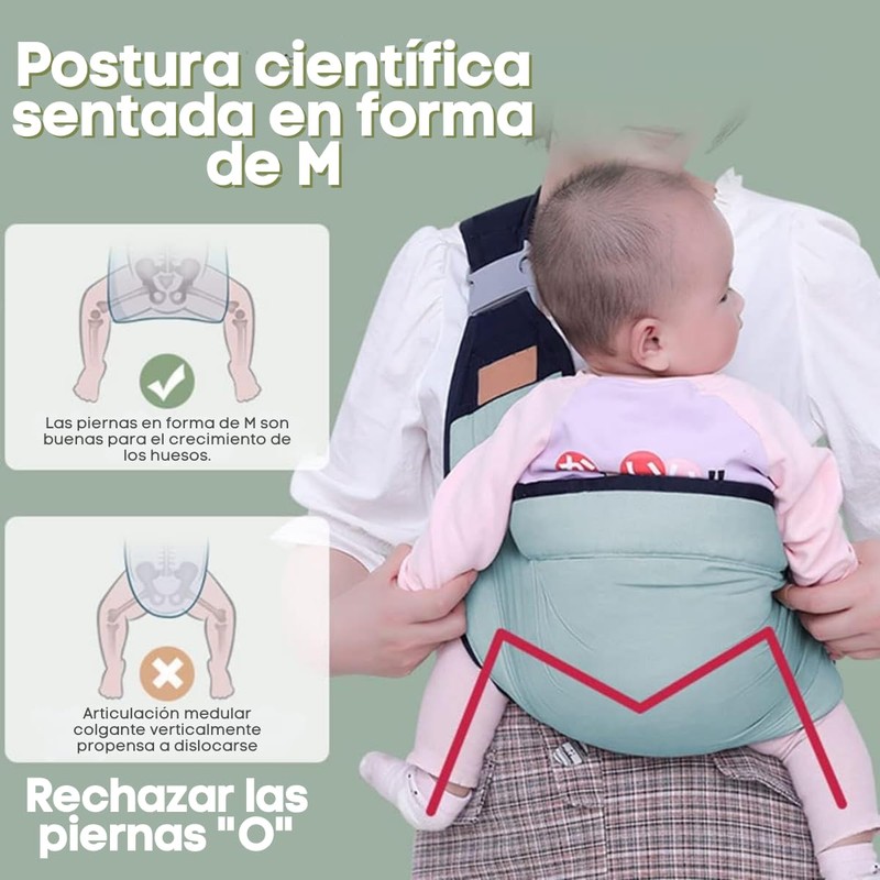 - Con una capacidad de soporte hasta 18 kg, este portabebés permite diferentes posiciones de uso: en el frente, la espalda, mirando hacia adelante o hacia el portador, adaptándose a las necesidades del bebé y del usuario. Además, el soporte es ergonómico, proporcionando un confort óptimo para el bebé y una distribución equilibrada del peso para quien lo lleva, aliviando la tensión en la espalda y hombros del adulto.