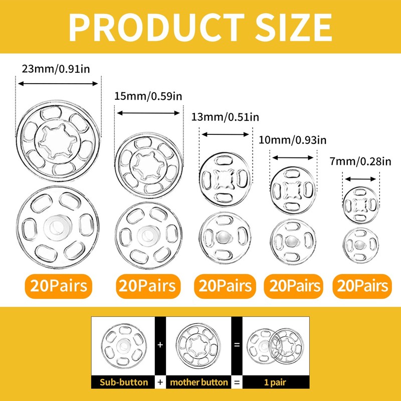 - Enhance your sewing and crafting projects with our 100 Pairs Plastic Snap Fasteners Kit, the good solution for adding reliable and invisible closures to your garments, accessories, and DIY creations. This comprehensive kit includes 100 pairs of plastic snap fasteners in five different sizes: 7mm, 10mm, 13mm, 15mm, and 23mm, ensuring you have the right size for every project.