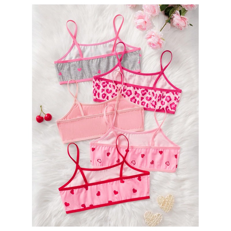 - Training bras, 5 piece set, scoop neck, spaghetti strap, heart print, leopard print, allover print, wireless