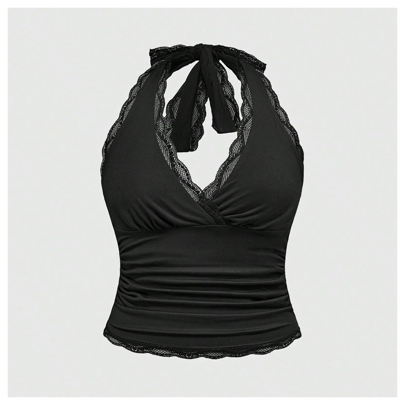 Verdusa Women's Plus Size Lace Tie Back Halter Tops Goth Rave Wrap V Neck Cor...