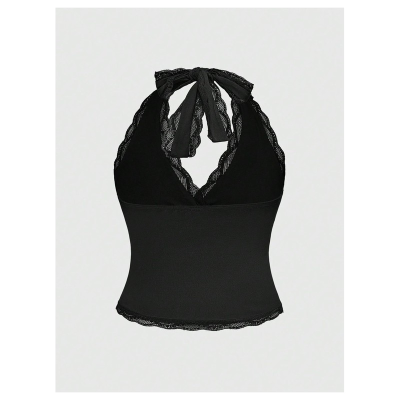 Verdusa Women's Plus Size Lace Tie Back Halter Tops Goth Rave Wrap V Neck Corset Tops Black X-Large Plus