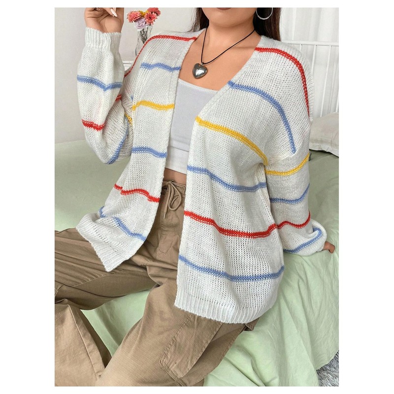 Verdusa Women's Plus Size Striped Long Sleeve Open Front Loose Knitted Cardigan Sweater Beige Multi 0XL