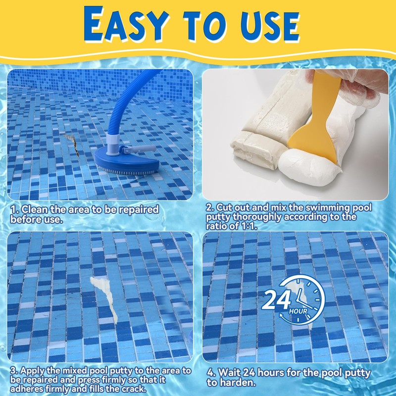 - Easy to Use: Designed for DIY repairs, this 2 part epoxy putty is user-friendly and requires no professional tools or skills. Simply knead pool repair putty in a 1 to 1 ratio and apply it to any cracks or leaks and it will cure into a color-stable finish for a flawless, professional repair with ease