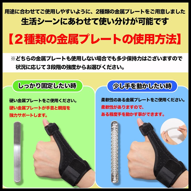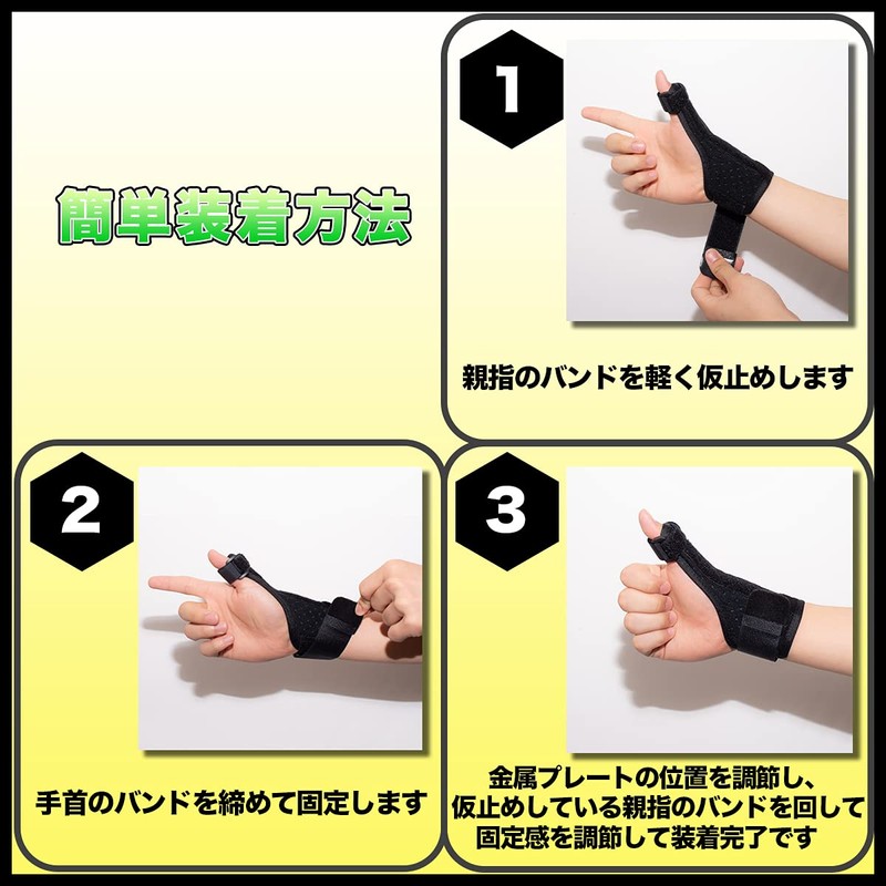 - 使い方は簡単。(1)親指のバンドを軽く仮止めします (2)手首のバンドを締めて固定します (3)金属プレートの位置を調節し、仮止めしている親指のバンドを回して固定感を調節して装着完了です。