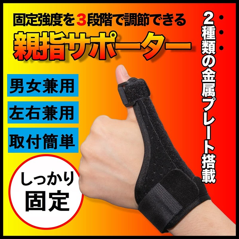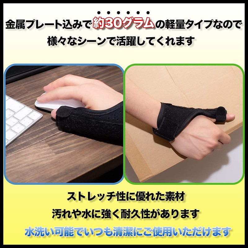 - 親指に違和感や不快感はありませんか?重い荷物を持つ、長時間のPC作業、育児で抱っこが多い、親指の付け根が痛い、腱鞘炎、バネ指、関節痛、関節症、突き指、骨折など。 親指と手首をしっかり固定して不快感を和らげます。