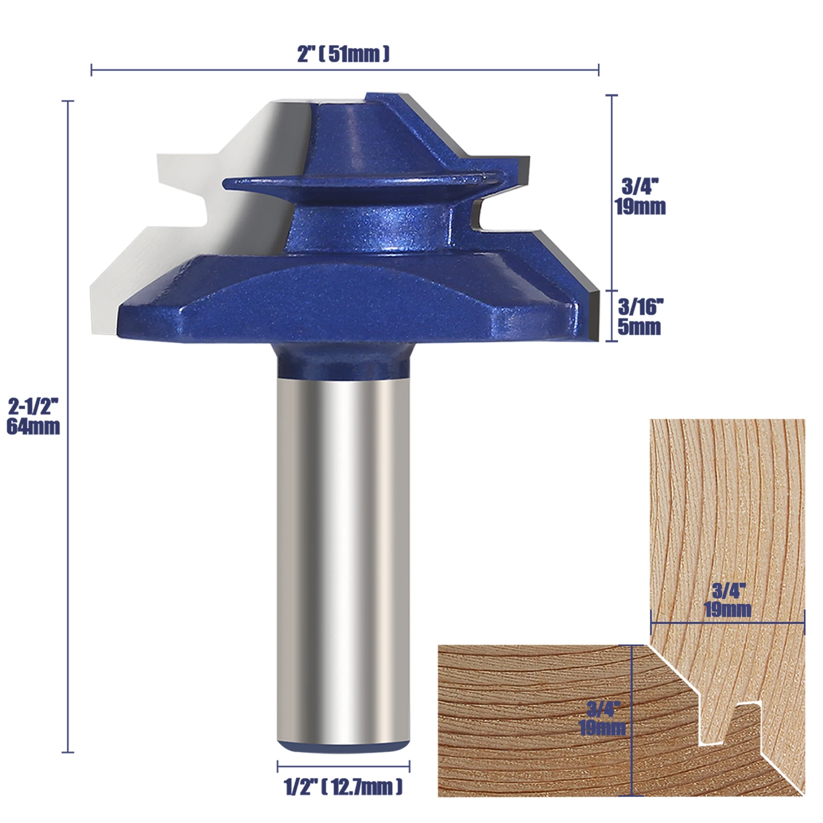 【HIGH-QUALITY】Boasting high quality alloy blade, high quality craftsmanship and solid hardened steel board, max strength and durable. With clever Anti-Kickback Design for optimal safety. Smooth rotation and ultra-sharp blades will cut with precision and ease. 【SPECIFICATIONS】1/2 inch shank 45 degree lock miter router bit, 2 inch in blade diameter, 3/4 inch stock. Mainly used for joining wood edge to edge, it will provide a durable joint. 【WIDELY USED】Suitable for woods, MDF, particle board, plywood compact panel, Great for making a wood drawer, window, cupboard or other woodworking projects. Avoid cutting ferrous metal and non wood materials, such as: steel, iron, sand, etc. 【EASY TO USE】Very easy to operate, Ideal for professionals and amateurs, for your daily woodworking Work brings great convenience. Designed for a router table or desktop woodworking engraving machine like CNC hand-held and table-mounted portable router, can not be used in electric drill & drill machines. 【CUSTOMER SERVICE】We provide 100% satisfaction service, if you have any questions, please don’t hesitate to contact us. Kindly reminder for our customer checks the size of shank your router takes before place an order to avoid ordring in mistake.