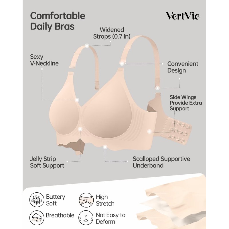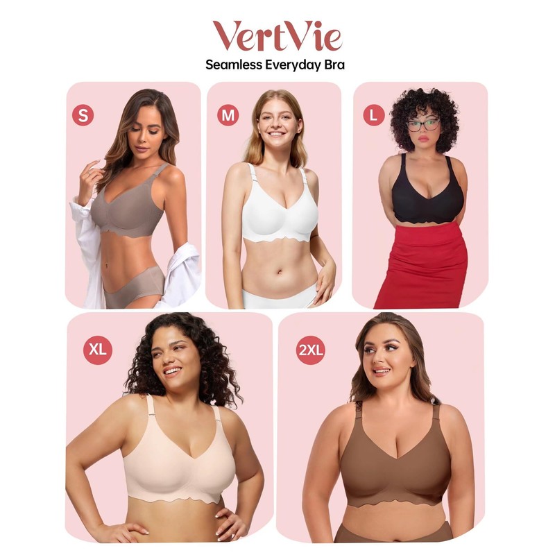 - No Feeling Everyday Bra: You can wear it as an everyday bra, T-shirt bra, padded sleep bra, or light sports bra. The sizes available are as follows: S (32B, 32C, 32D, 34B); M (32DD, 34C, 34D, 36B); L (34DD, 36C, 36D, 38B); XL (36DD, 38C, 38D, 40B); 2XL (38DD, 40C, 40D, 42B); and 3XL (40DD, 42C, 42D). VertVie Bras are suitable for both younger and older women