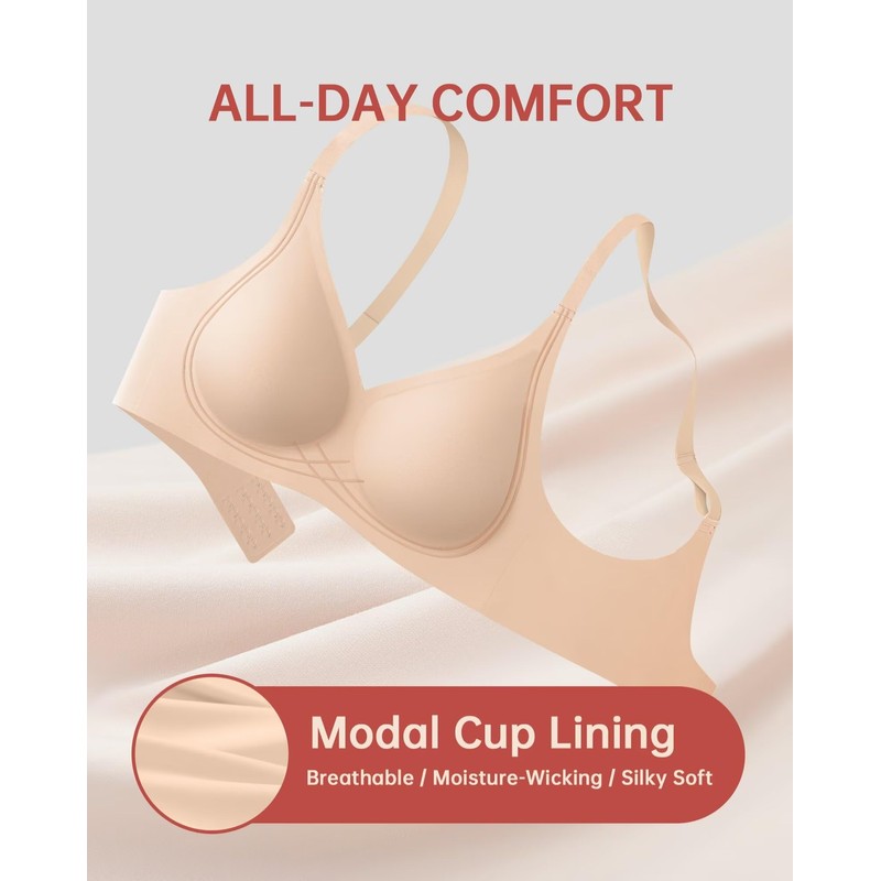 - Upgraded Comfort Bra: Our bras for women no underwire are crafted with a modal lining fabric that is highly absorbent, soft, and durable, offering a fresh and airy feel all day long. The semi-fixed chest pads are made from breathable cotton, providing a cool and comfortable experience. Seamless and non-see-through for a smooth, invisible fit under any outfit