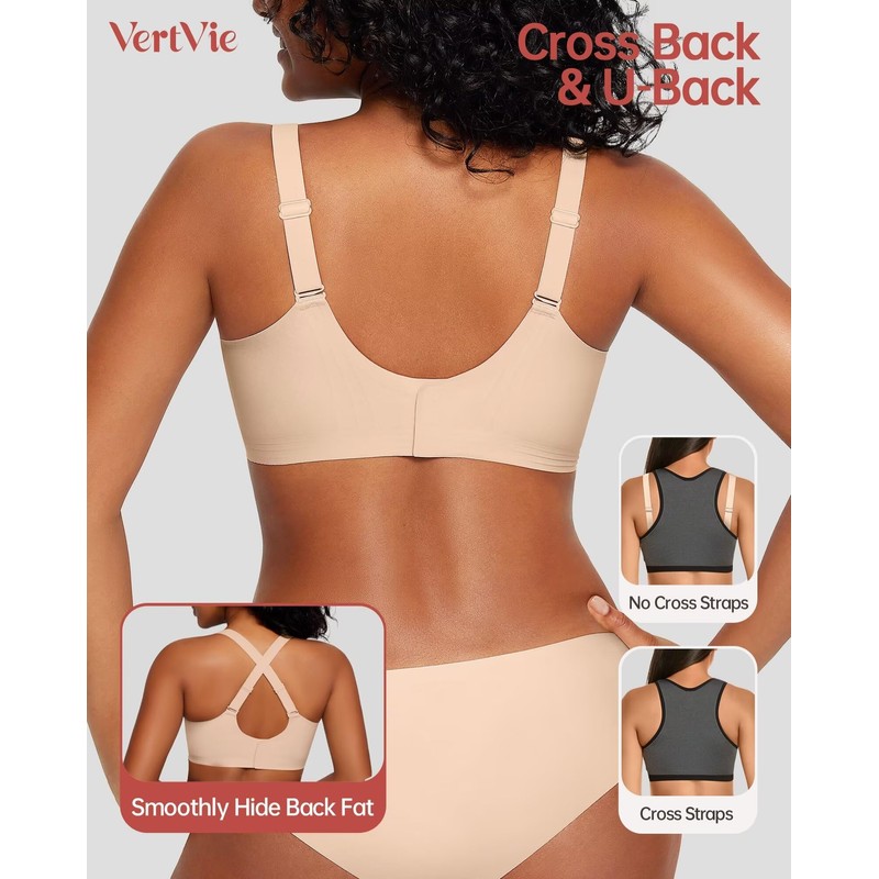 - Stylish Plunge T-Shirt Bras: This women's wireless bra features a deep V-neck design that enhances breast curves. It's perfect for low-cut tops and dresses and pairs well with necklaces. The convertible straps offer versatile wearing options. The X-back design lifts and supports, working like a racerback to prevent slipping. The U-back design smooths out side bulges and back fat for a sleek look